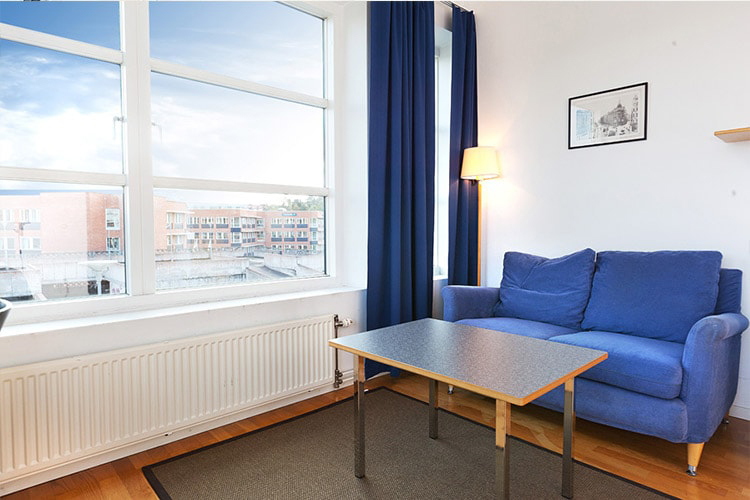 Öppna och ljusa Studios med hemtrevlig inredning, trägolv och kaklade badrum.